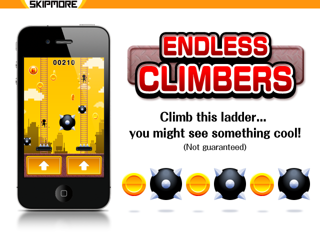 Clamber up the ladder and grab coins as you go! But watch out for the spike traps! If one of the climbers slips, it's THE END for you! - Platforms: iPhone, iPod touch, Android - Art, sound, and game design: SKIPMORE - Programming: URARA-WORKS