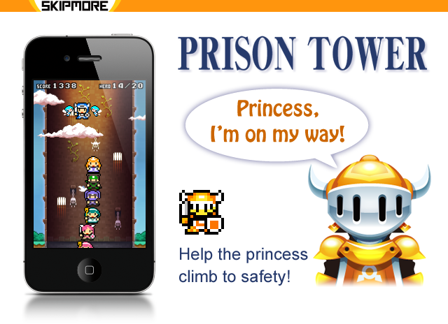 Stack ‘em up and clamber on up! Build a stack of heroes and help the princess climb to safety! An exciting new twist on block stacking games! - Platforms: iPhone, iPod touch, Android - Art, sound, and game design: SKIPMORE - Programming: URARA-WORKS