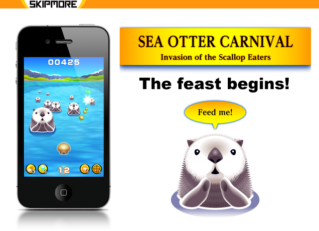 Aim for an otter and launch a scallop! These cute otters are feisty eaters… keep on chucking – I mean feeding – scallops to the hungry lot! - Platforms: iPhone, iPod touch, Android - Art, sound, and game design: SKIPMORE - Programming: URARA-WORKS